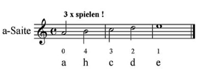 Auf den nächsten beiden Saiten haben wir hingegen ein anderes Griffschema. Durch die auf der vorherigen Seite beschrieben Dur-Tonschritte ergibt sich jetzt der HT zwischen e und f, also zwischen dem Ring- und Mittelfinger. Das gilt für die D - und beide A - Saiten. Diese sind 2-fach vorhanden, um leichter Doppelgriffe und schnellere Tonfolgen über beide Saiten zu spielen.